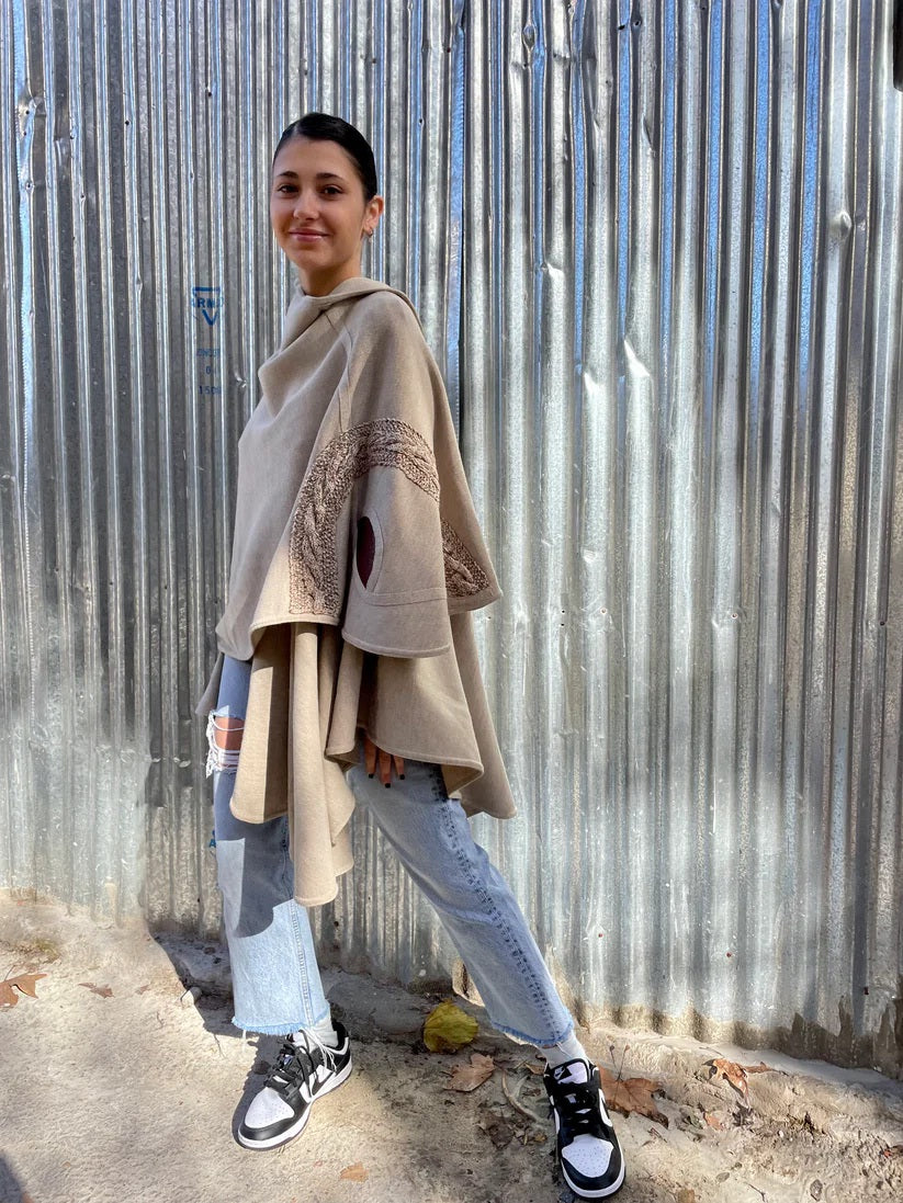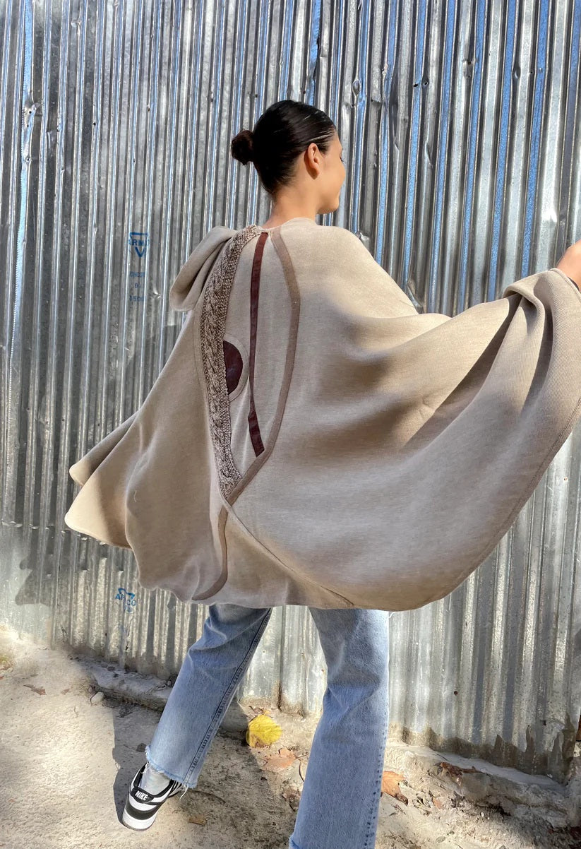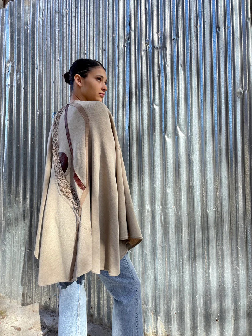 Tejido de punto en lana con apliques en cuero.