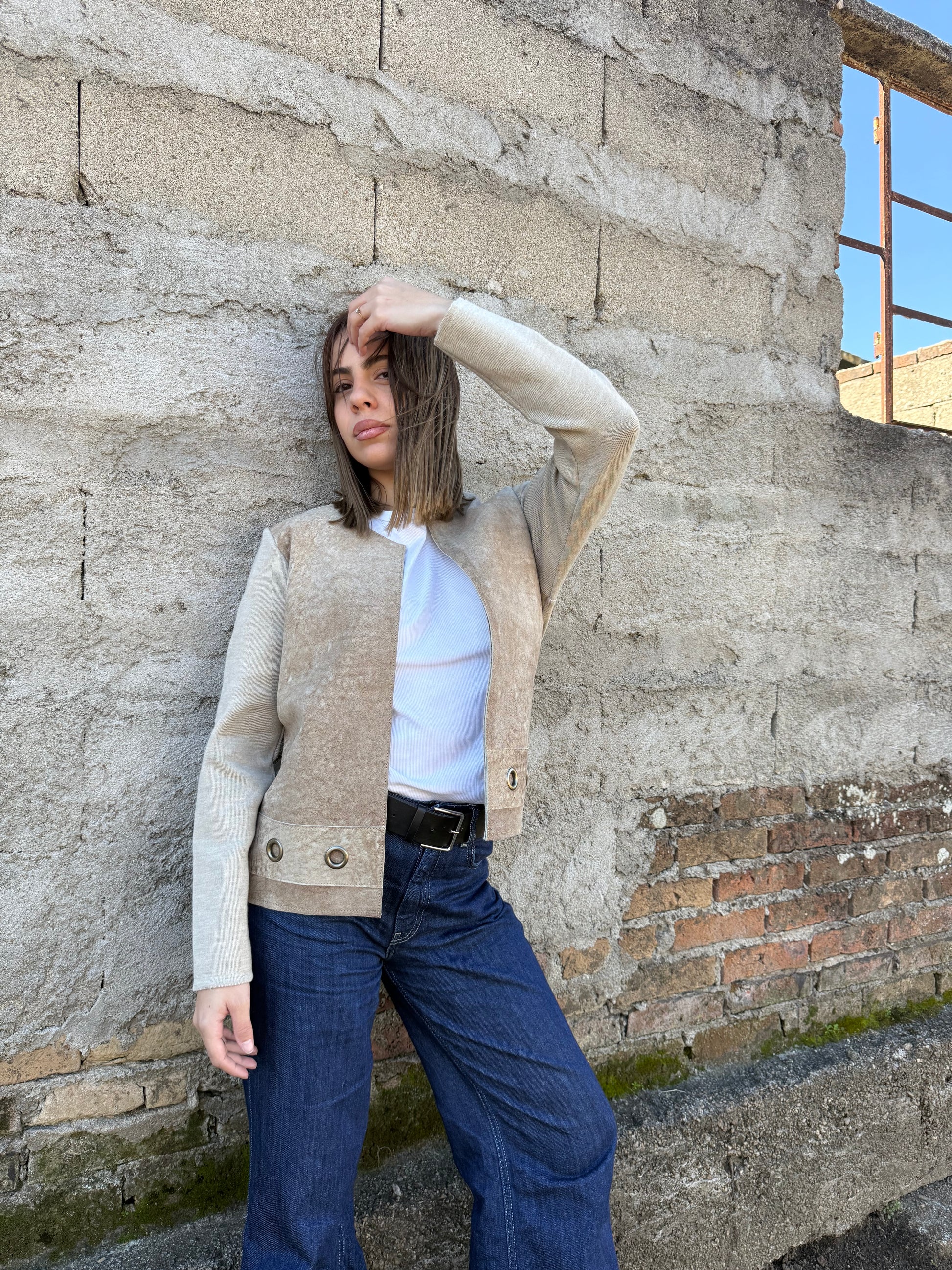 Tejido de punto en hilo de algodón con cuero azul Plata y crudo. Talle unico