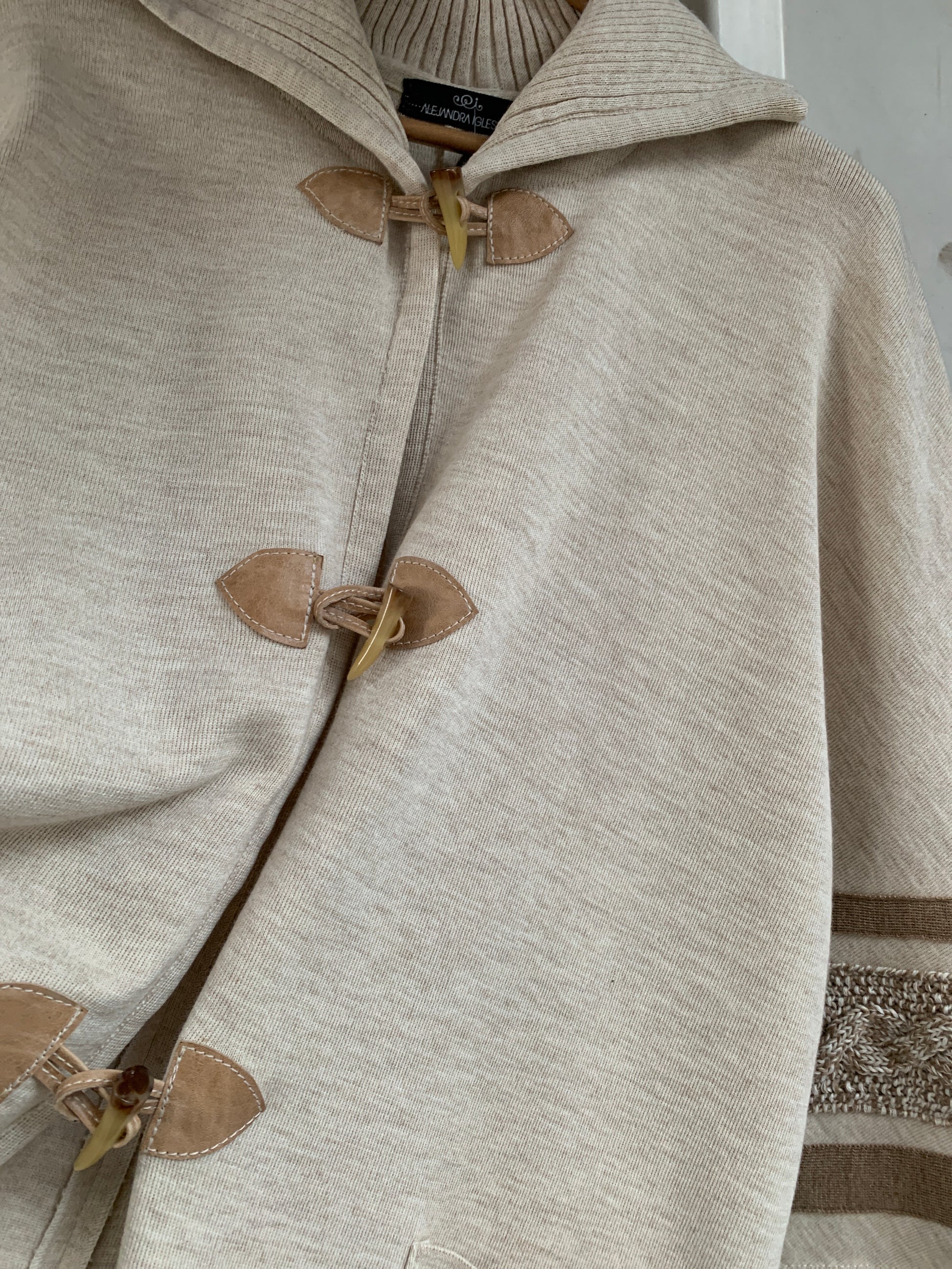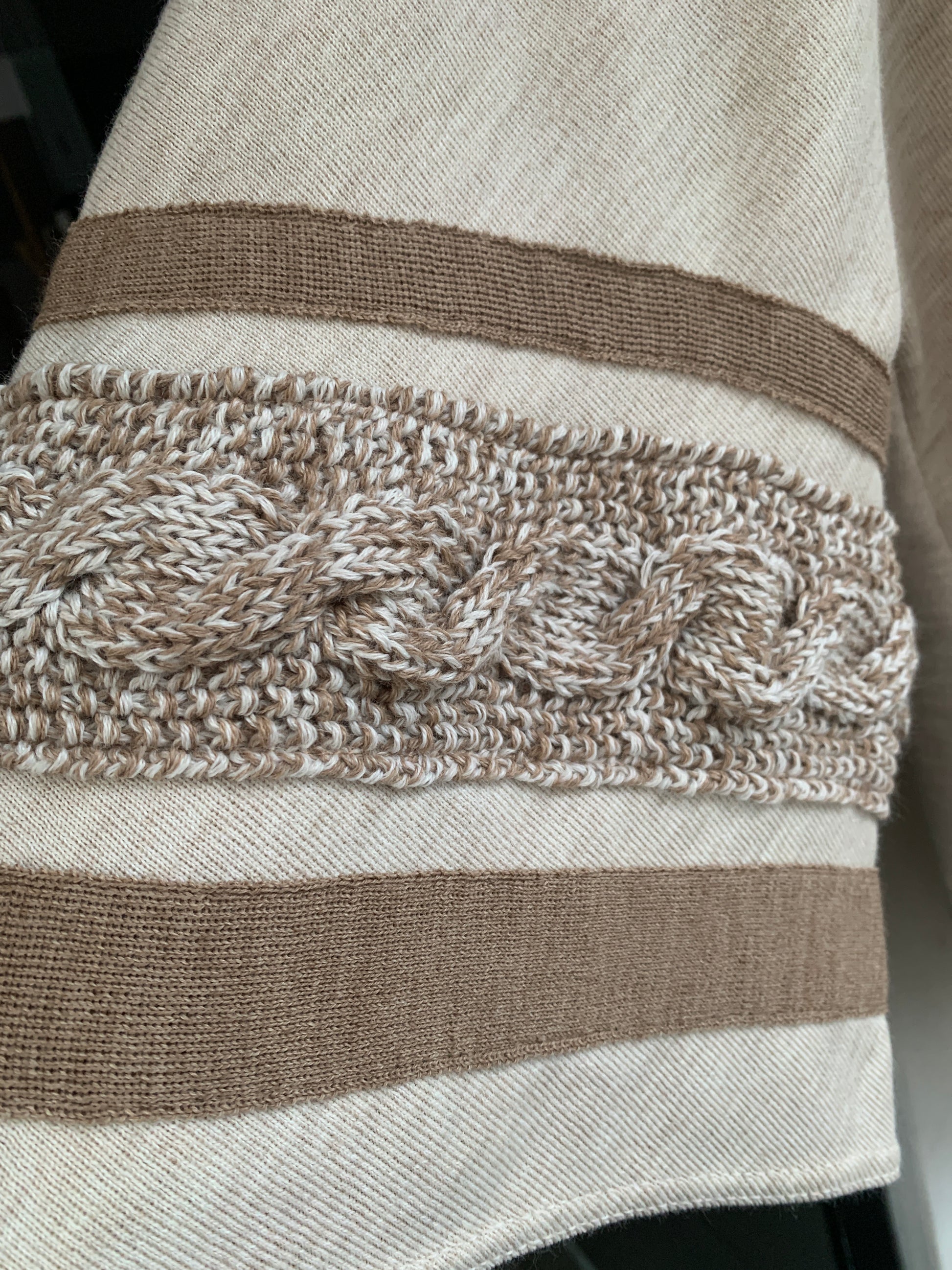 Tejido de punto fino en lana con detalles de cintas tejidas y trenza. talle único.