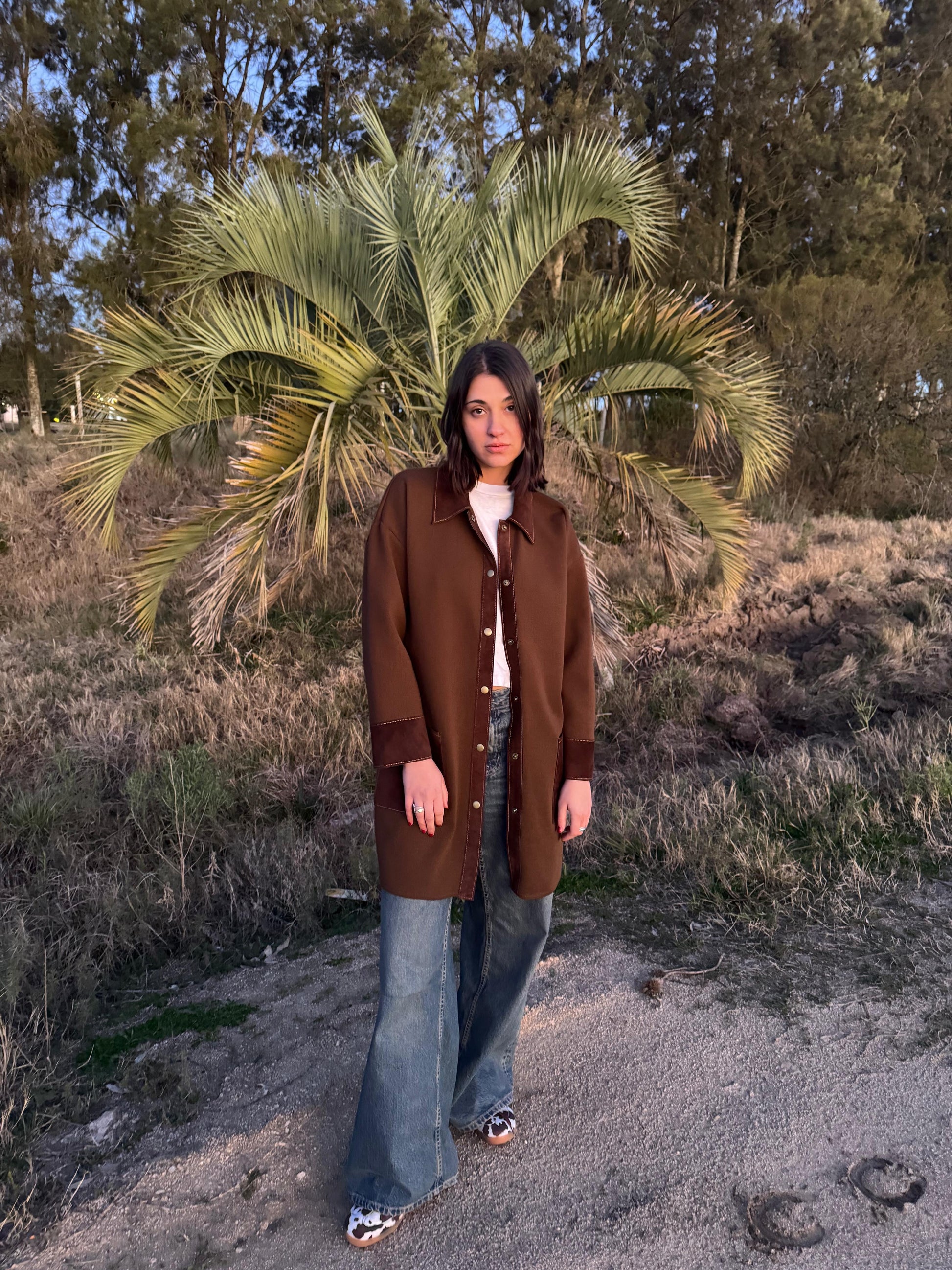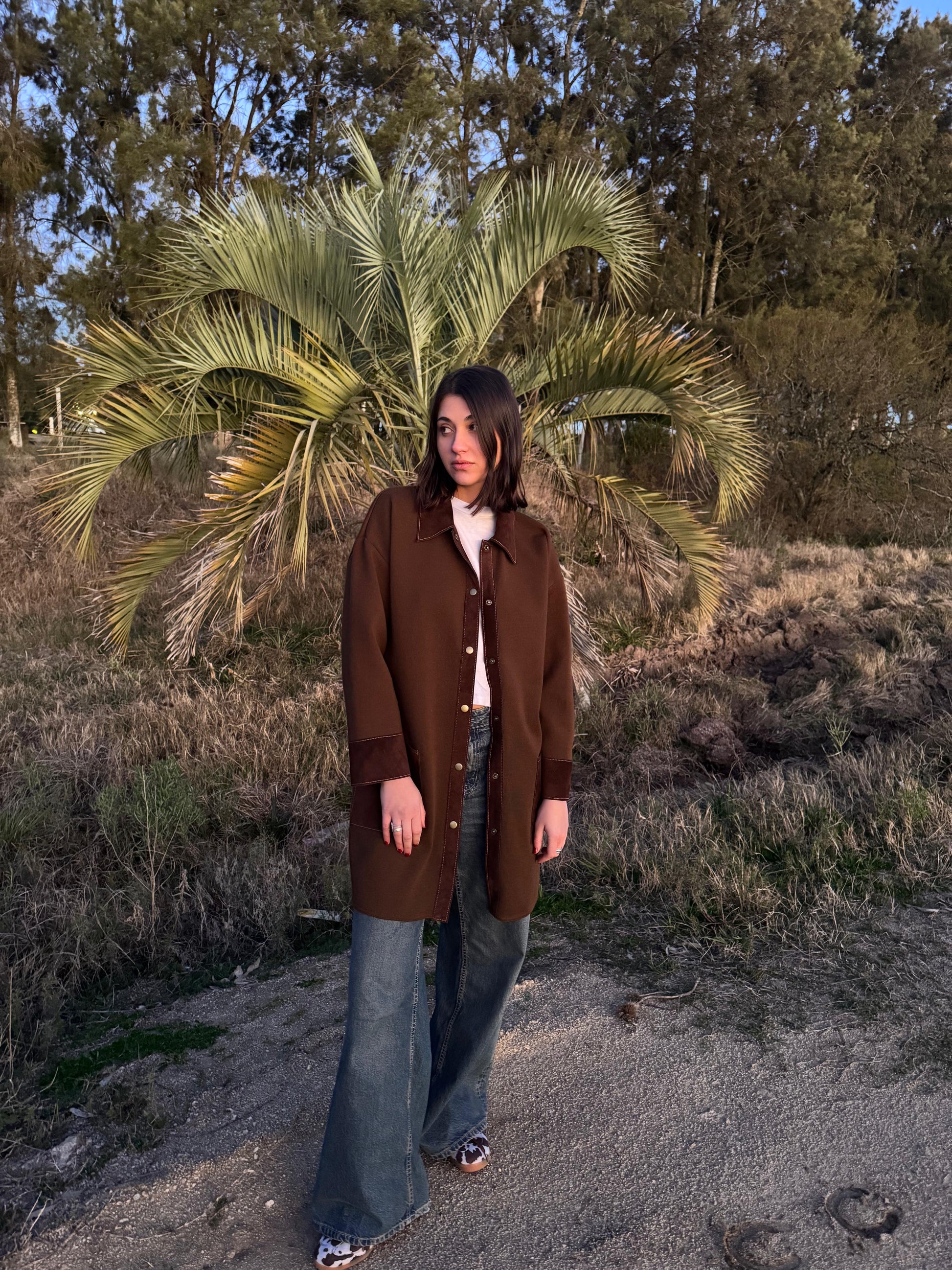 Tejido en lana con cuero . Talle 3 medidas : busto 115 cm , cadera 122 cm largo 85 cm .