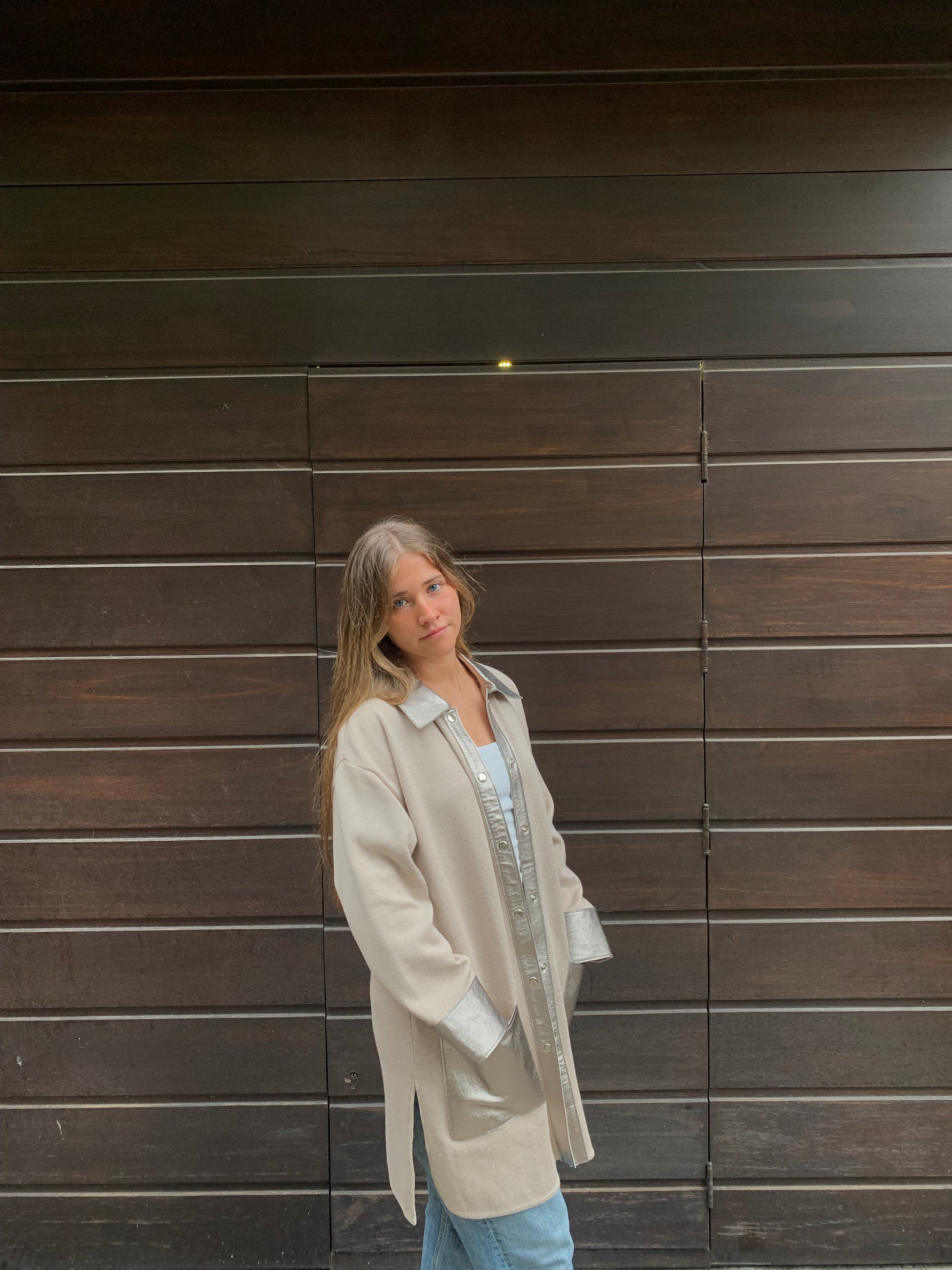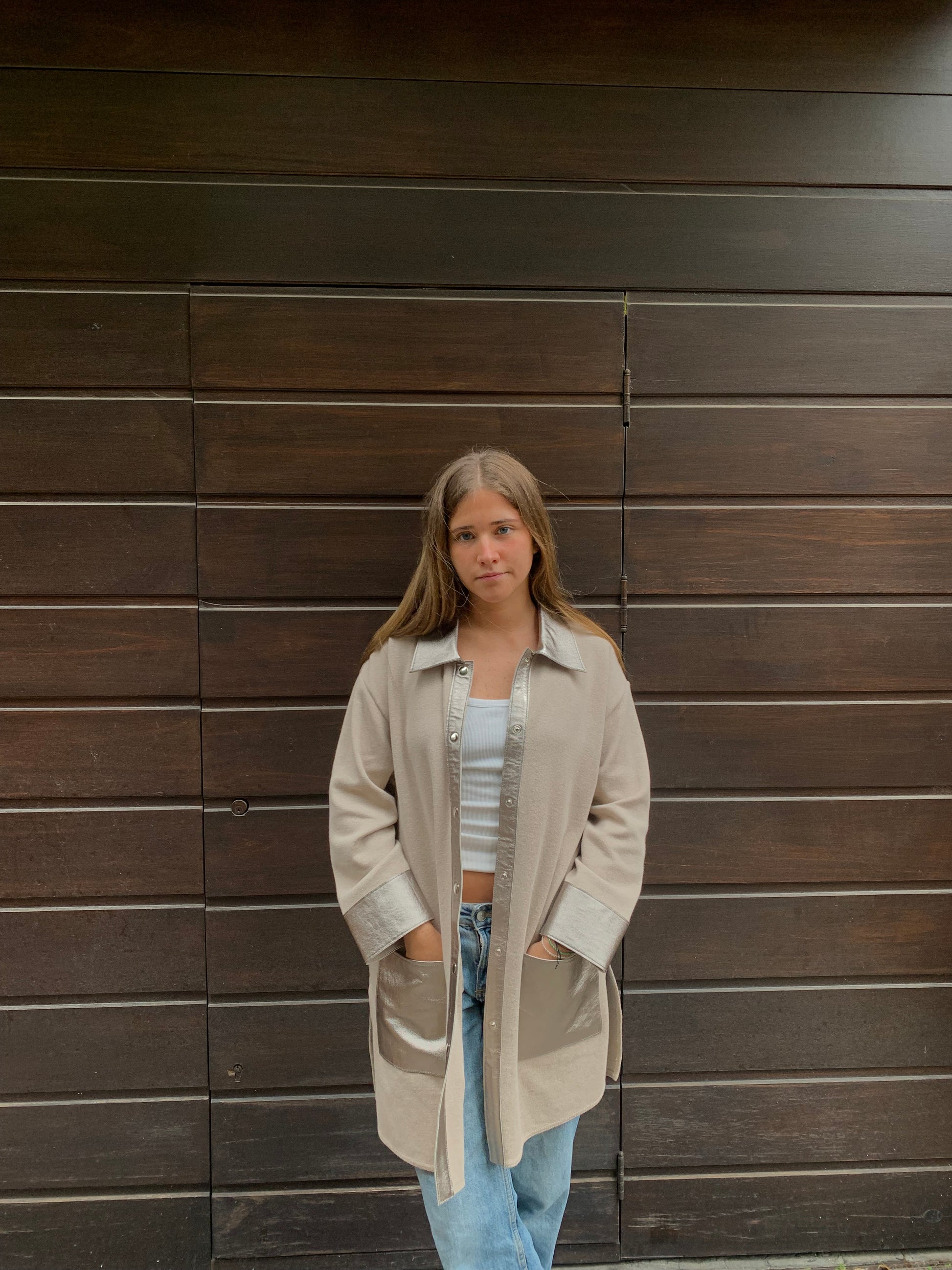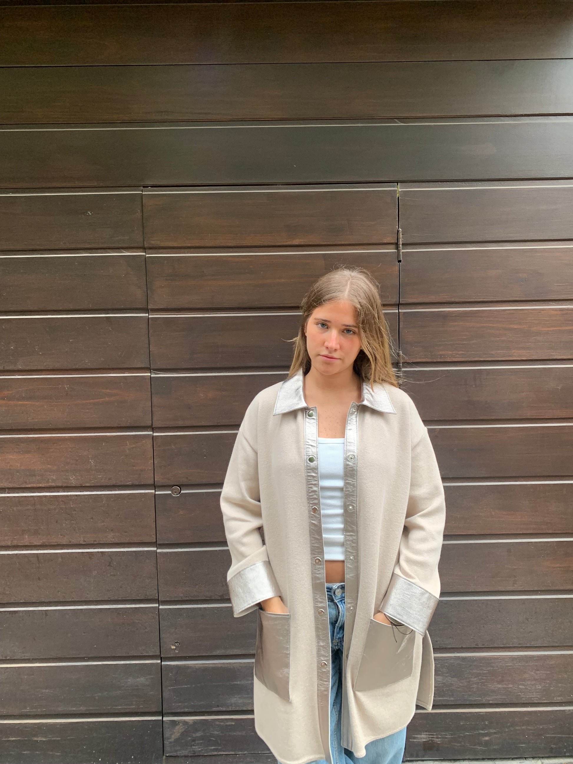 Tejido en algodón con cuero color acero .MEDIDAS :talle 2 . Busto 102 cm . Cadera ; 106 cm